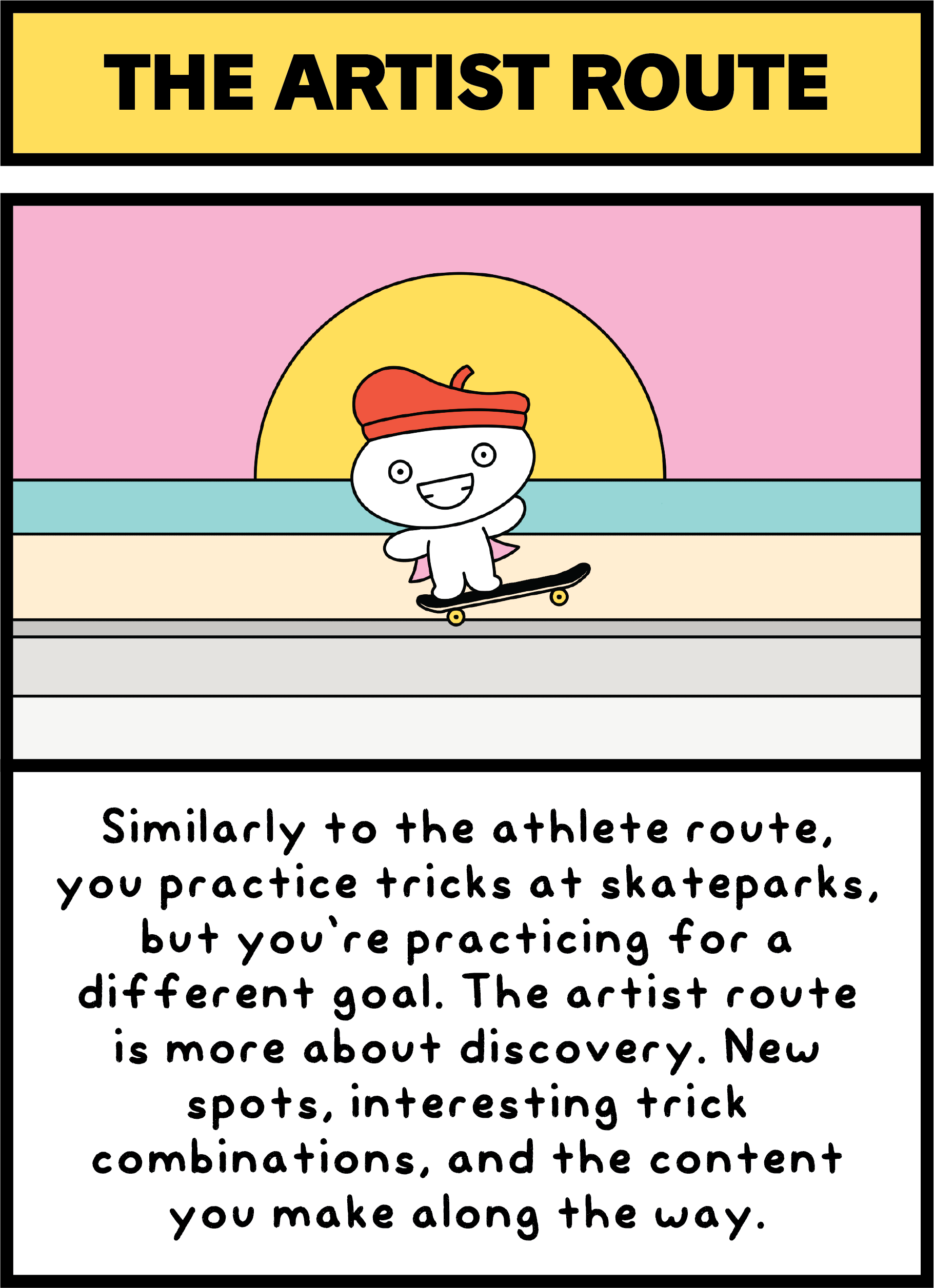 You can take both routes at the same time. The essence of skateboarding, for me, lies in the Artist Route, so through out my website, and content, that is the route I’ll be sharing and teaching.